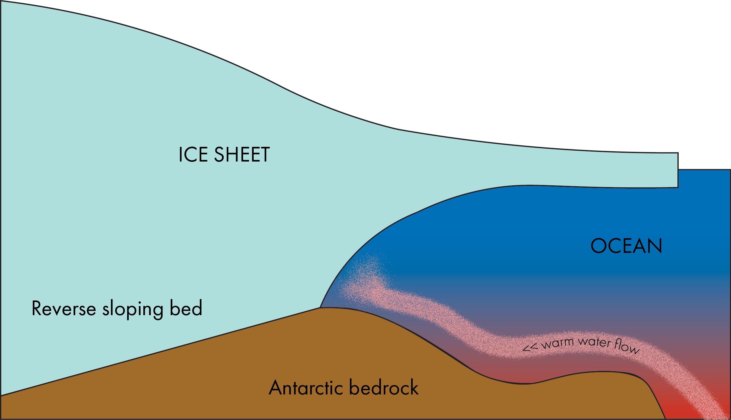 Where the bedrock slopes downwards and the interior is deeper than the coast (a ‘reverse sloping bed’), the ice sheet is inherently unstable, known as ‘marine ice sheet instability’.