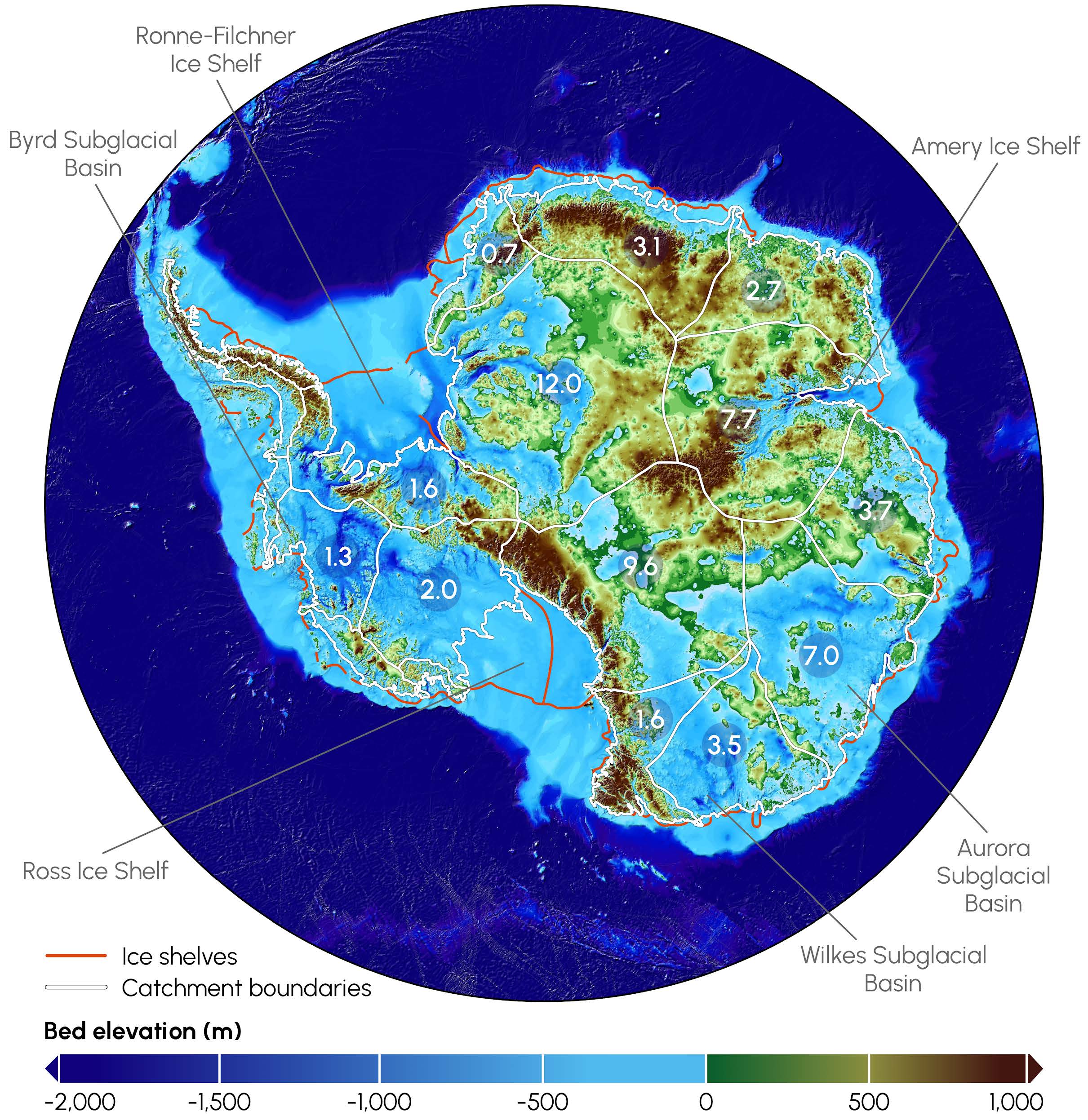 The topography of Antarctic bedrock, overlain with ice drainage basins, ice shelves and estimated global mean sea-level potential from each basin in metres (from Galton-Fenzi et al. 2024 12 )